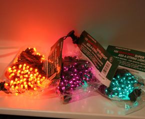 Halloween Lights - Indoor/Outdoor Halloween Lights with Ceramic Orange, Green or Purple Lights and Black Wire. Strand of 100 Halloween Lights $12.99 each. Heavy Duty, Super Bright Halloween Lights with 3.5" spacing for Special Halloween Decorating. Set has Socket Lock Feature which holds the bulbs in place. Total length of this Halloween Light Set is 29 feet.